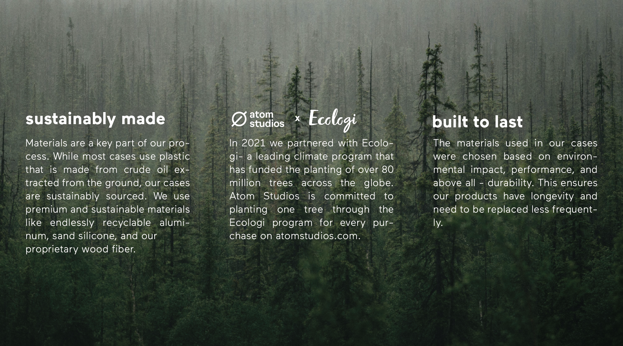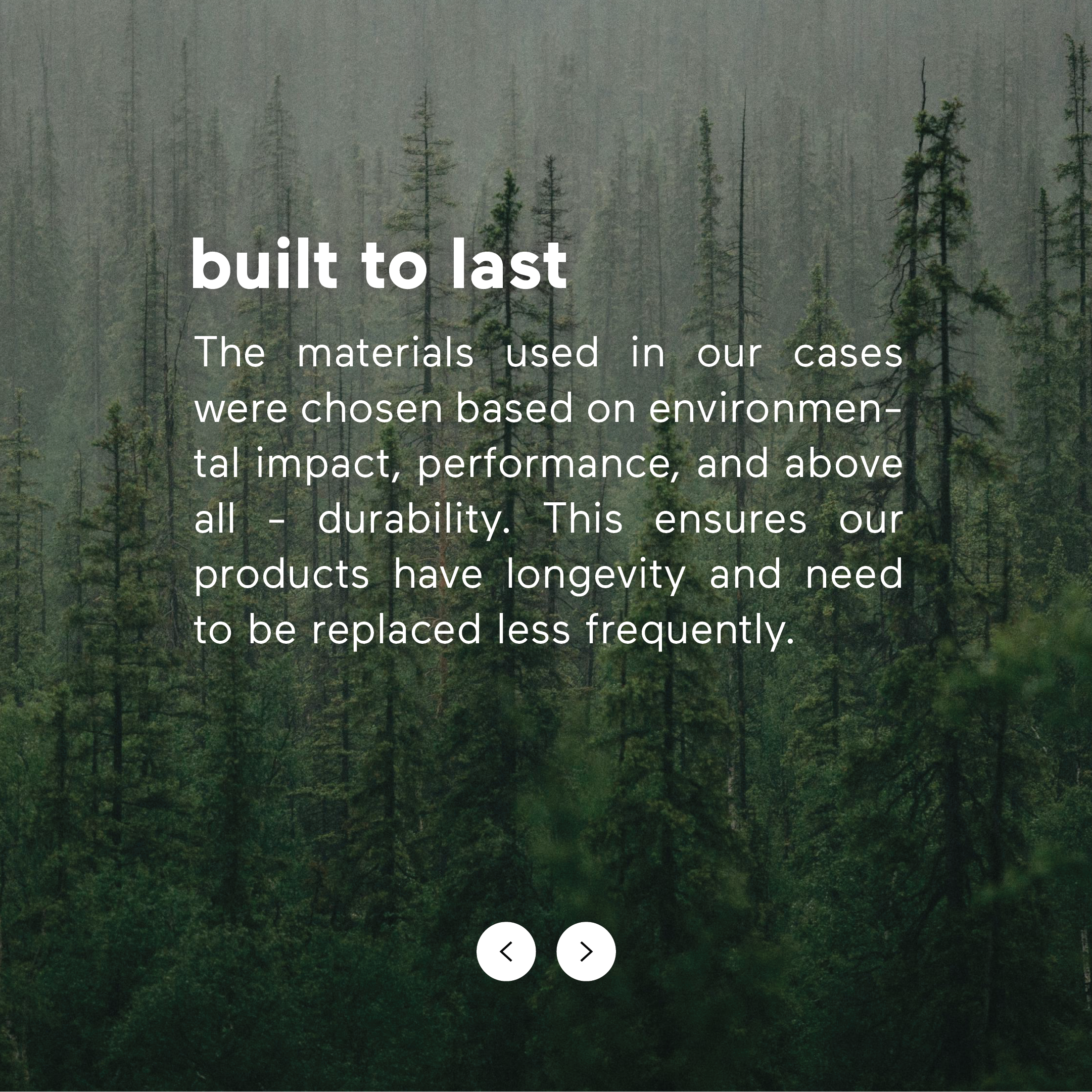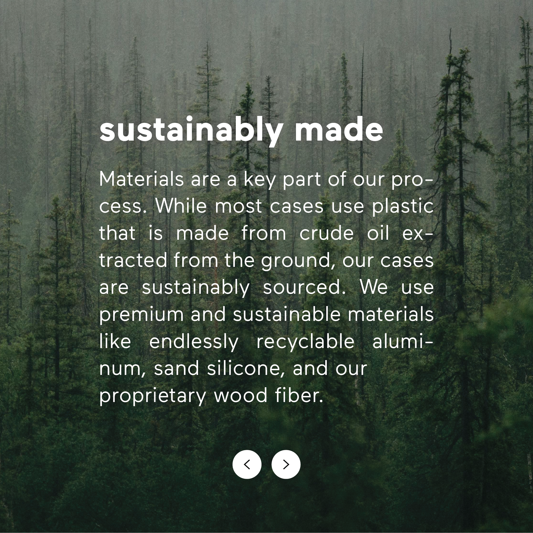 With cases made from sand silicone, recycled aluminum and proprietary wood fiber, materials are a key part of our process. Sustainably conscious and selected for their premium qualities - performance and tactility are paramount. From their source to the way they feel in our hands, our materials have been considered with both people and planet in mind.